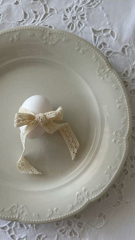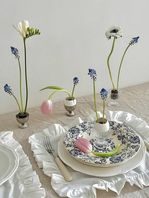 While I’m all for a less conventional palette, I do think an Easter table needs some kind of egg moment. My favourite way to incorporate this is with egg cups, filled with whole or cracked eggs, or even repurposed as miniature vases with a flower frog to hold a stem or two. They strike that balance of whimsical and elegant perfectly. If you don’t have egg cups, a single egg placed on the plate with a bow tied around it is simple, sweet, and effective.
