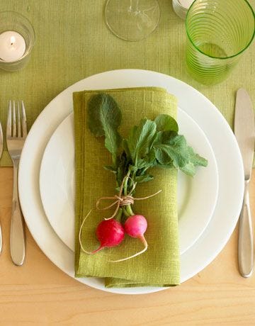 I like to carry that same energy from the menu onto the table. Use creams and greens as the base and anchor, then layer in vibrant pops of colour. My favourite is that stunning pink you see in radishes and rhubarb, or orange if you want to highlight the Easter vegetable, the carrot. When using actual vegetables in the decor, I find less is more, and I always choose ones with their greens still attached, otherwise they can feel a little too supermarket. From there, double down on those colours across the table through linens, candlesticks, flowers, and name cards so everything feels considered and cohesive.